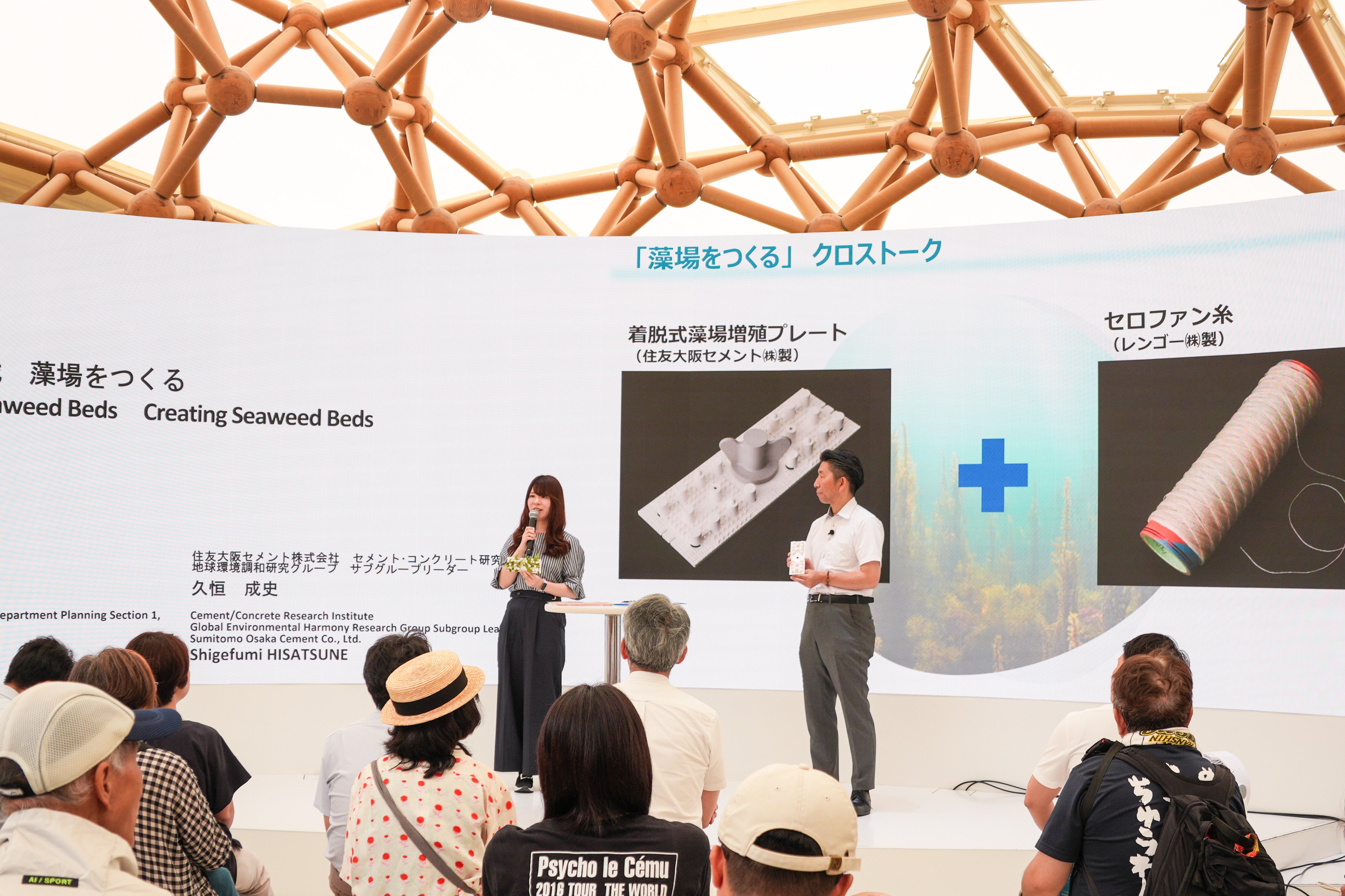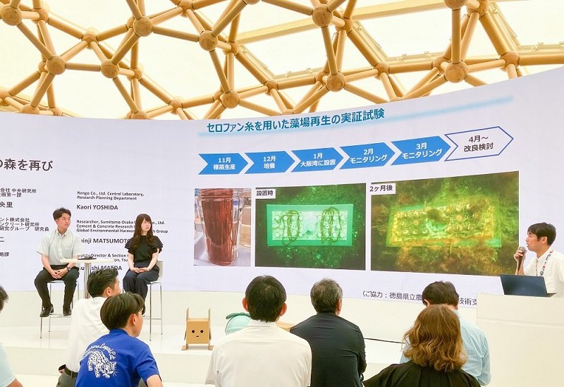 In the latter half of the session, there was a roundtable discussion between Rengo and Sumitomo Osaka Cement Co., Ltd. The companies demonstrated how their respective products could be combined to cultivate seaweed, and they presented their sustainable collaborative efforts for creating seaweed beds.