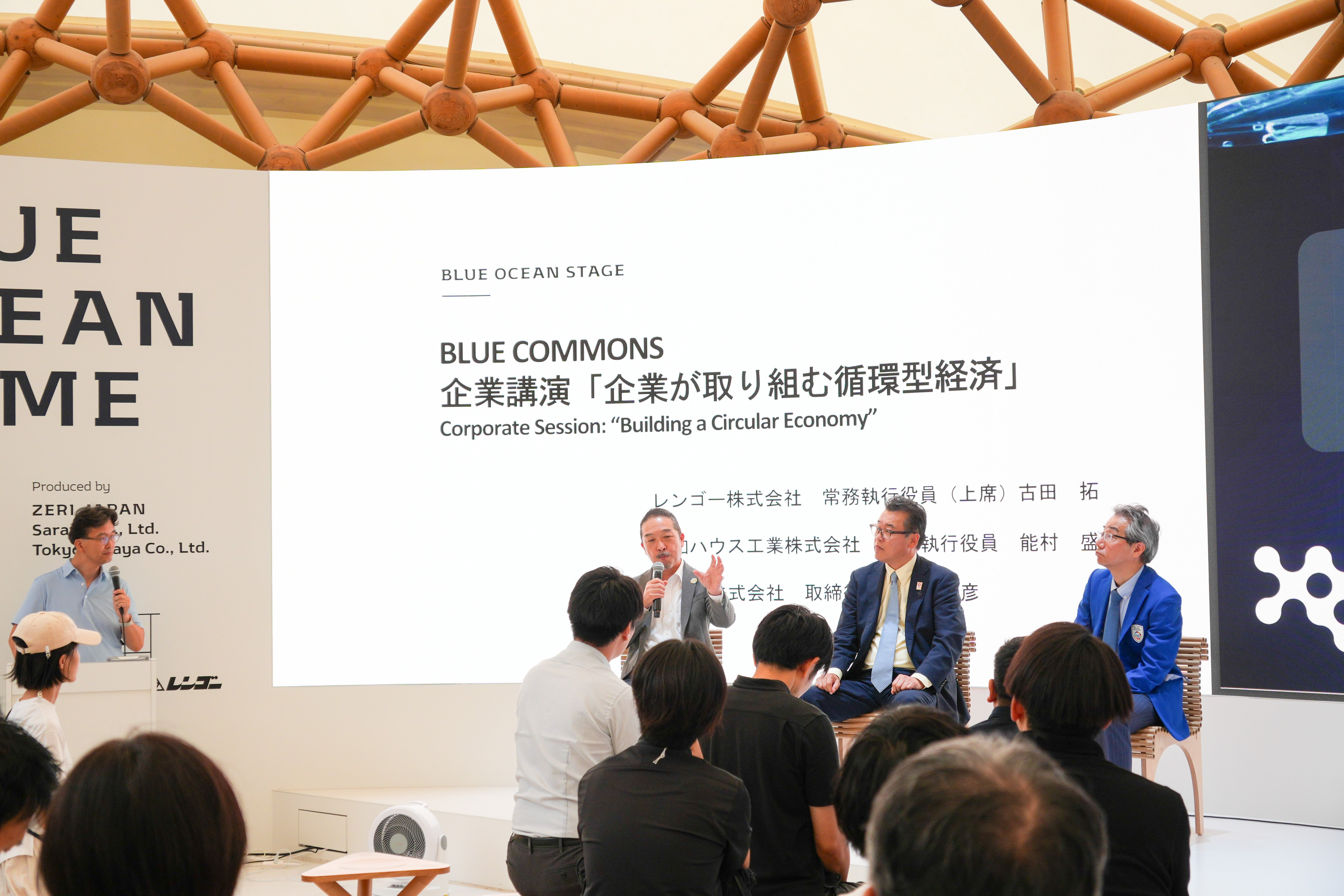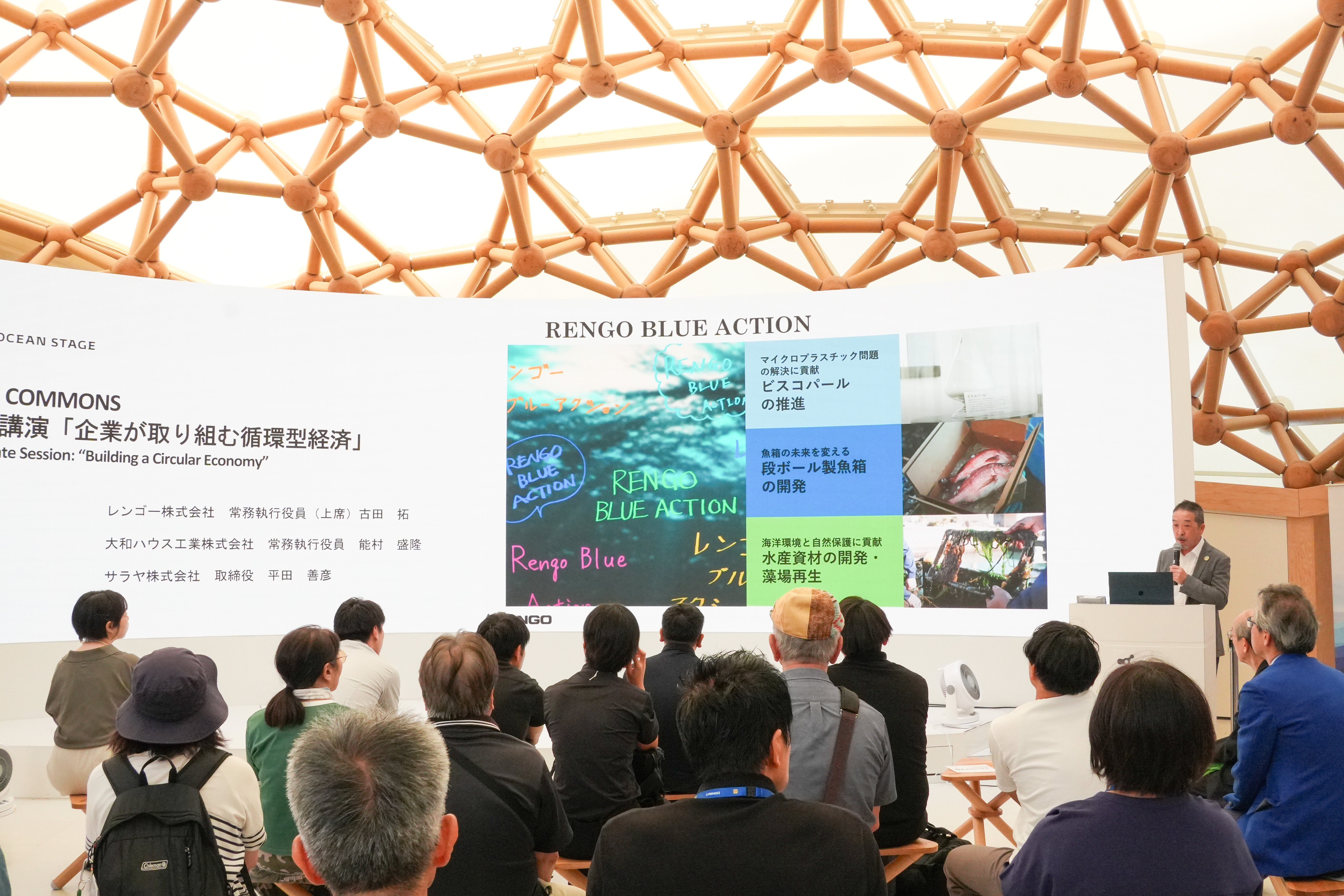 On the 15th, the Corporate Session on the theme of "Building a Circular Economy" was held. Lectures were given by representatives from Daiwa House Industry Co., Ltd., Saraya Co., Ltd., and Rengo Co., Ltd. (this company), who presented the cutting-edge resource circulation and sustainability initiatives that the companies supporting BLUE OCEAN DOME are carrying out. A roundtable discussion among the presenters was held in the second half.