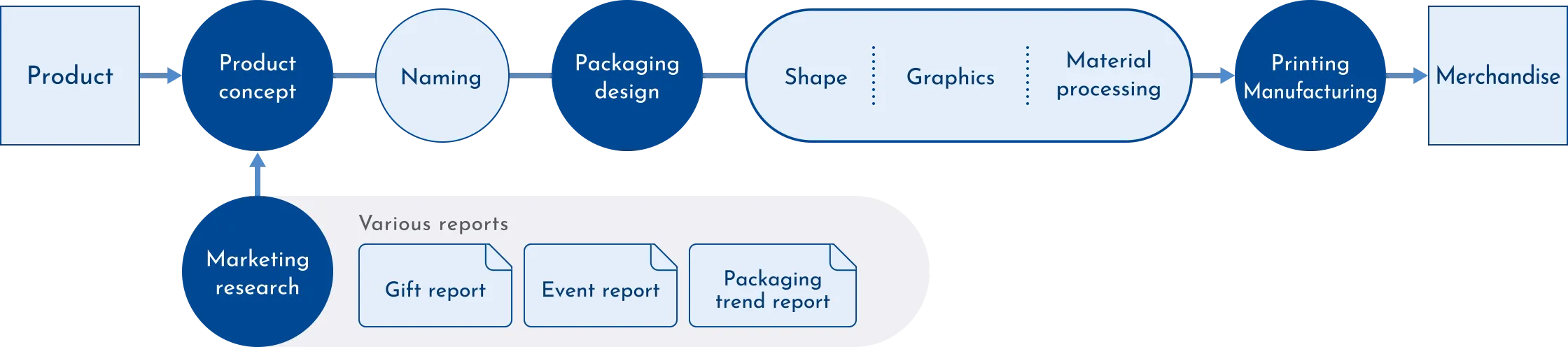 From the development of product names to the development of logos, one of Rengo's strengths is that we offer a one-stop service for almost all design and manufacturing needs related to products in terms of product packaging, gift packaging, and corrugated boxes. We use our potential as a comprehensive packaging manufacturer handling a wide range of materials—from corrugated packaging to folding cartons and films—to develop and design packaging which further heightens the appeal of products.