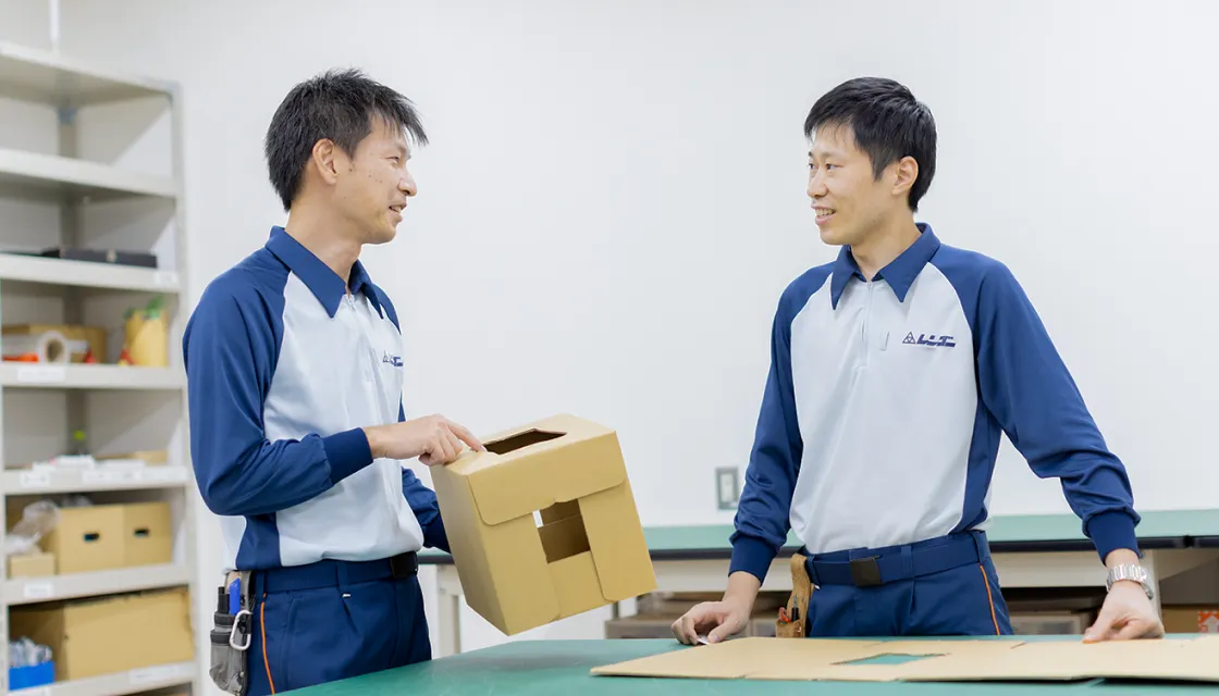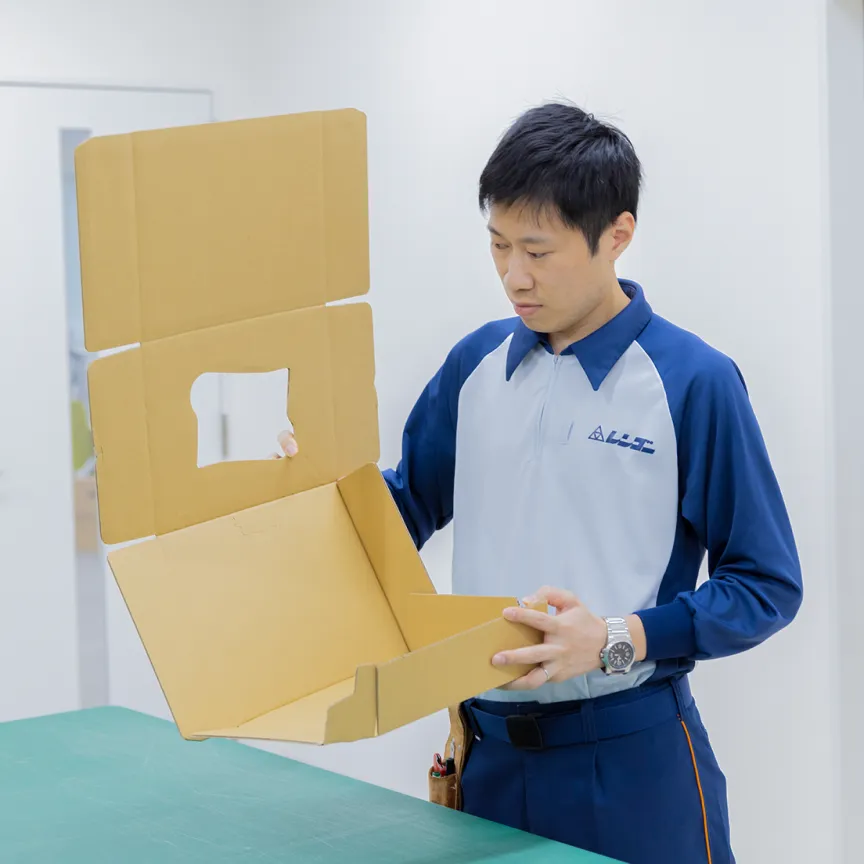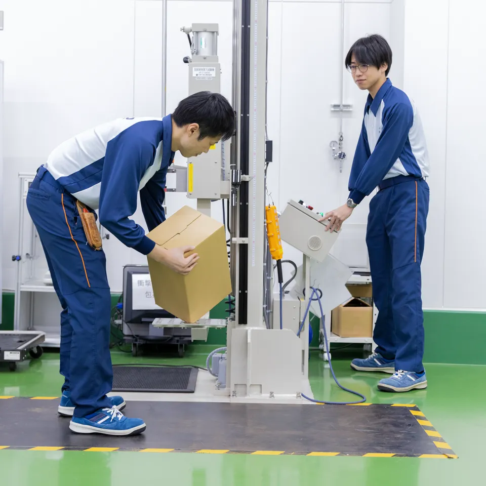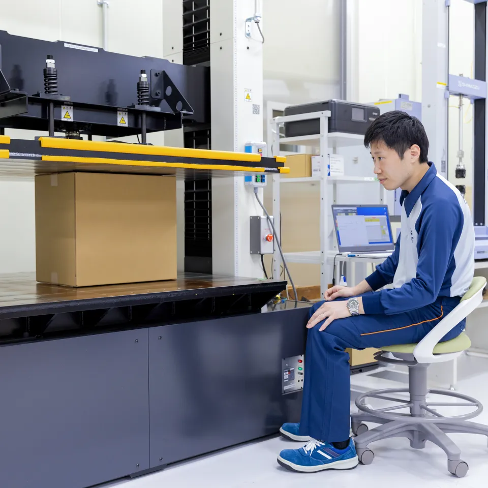 Rengo has a history of over 100 years as the leading company in corrugated packaging and other packaging, accumulating a vast amount of precious experimental data and knowledge not found elsewhere. Package testing—such as compression, vibration, and dropping—and environmental testing recreating temperature and humidity during the logistics process are also conducted under conditions as close to actual conditions as possible. In addition, we also carry out design with various ingenuities taking into consideration the psychological aspect of people handling parcels, such as using structures where the products within can be seen to encourage handling with care.