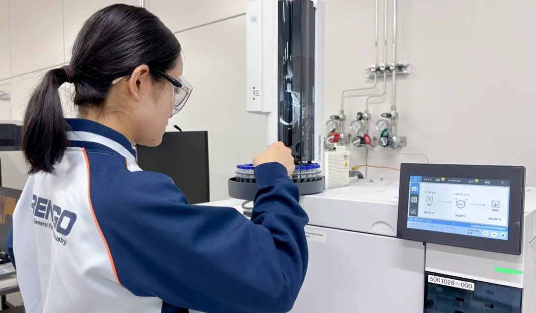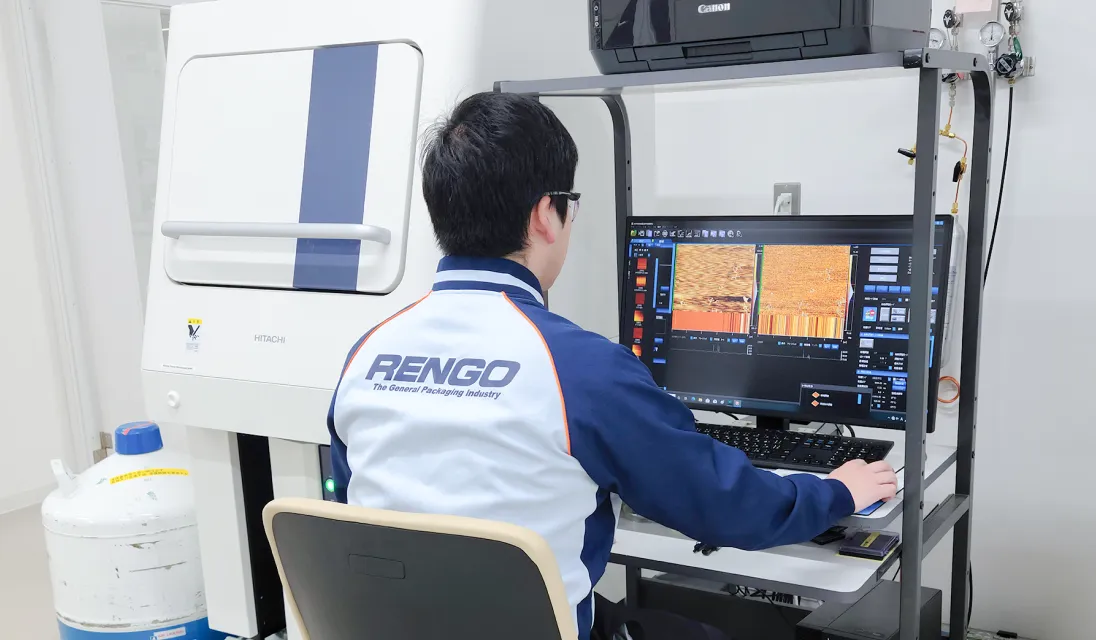 Rengo—which also offers many packaging products for food and beverages—conducts chemical analysis on material properties, product quality, impact on the environment, and so on. We believe that the pursuit of safety and peace of mind is the responsibility of a leading company, and also work on improving analysis technology.