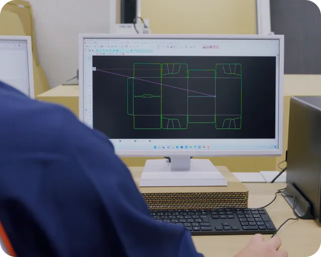 パッケージづくりは、包装する商品に合わせて一つひとつオーダーメードで進めます。商品の特性、輸送や保管の条件など、お客さまからのご要望をもとに完成品をイメージしながら包装設計を行い、実際の物流過程を想定した包装試験や環境試験を行います。完成した設計に商品の魅力を伝えるデザインを作成し、お客さまと打ち合わせを重ねながら商品に仕上げます。