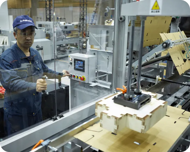 通販用の自動包装システム開発には多くの実績があり、商品サイズに合わせた箱を成形し、包装して積み付けるまでの工程を自動化します。無駄なスペースを最小限に抑え、包装効率を大幅に向上することで、輸送時の CO2 排出量削減に貢献します。段ボール箱設計チームと機械設計チームが連携し、最適な形態と自動化の機械をつくりあげられるのが強みです。